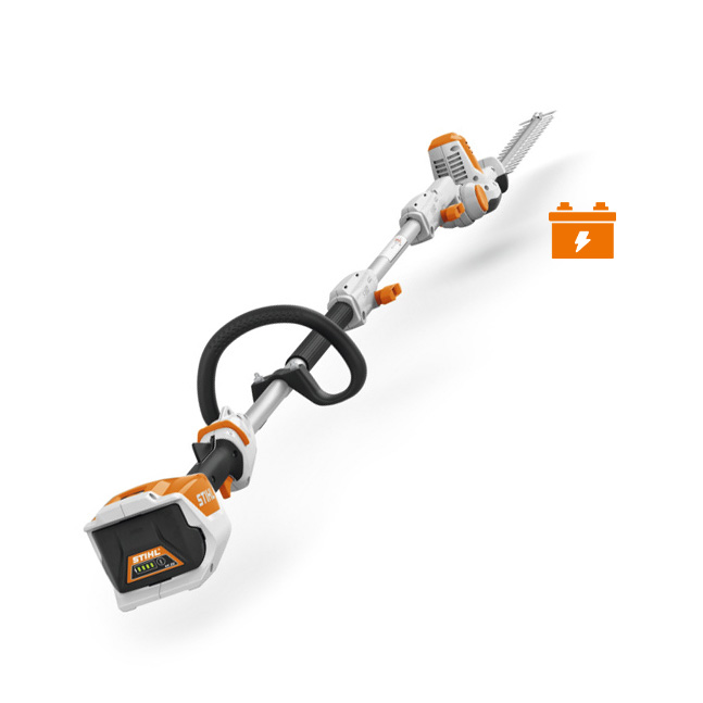Indicado para uso doméstico ocasional, o podador de altura a bateria HLA 56 é ideal para manutenção de jardins privados, no corte de cercas vivas, poda em árvores ornamentais e corte de arbustos altos de difícil acesso. A lâmina é ajustável em sete posições com possibilidade de acoplar um extensor de 50 cm, além de o eixo ser bipartido, facilitando o transporte. O modelo é disponibilizado com um suporte para fixação na parede.